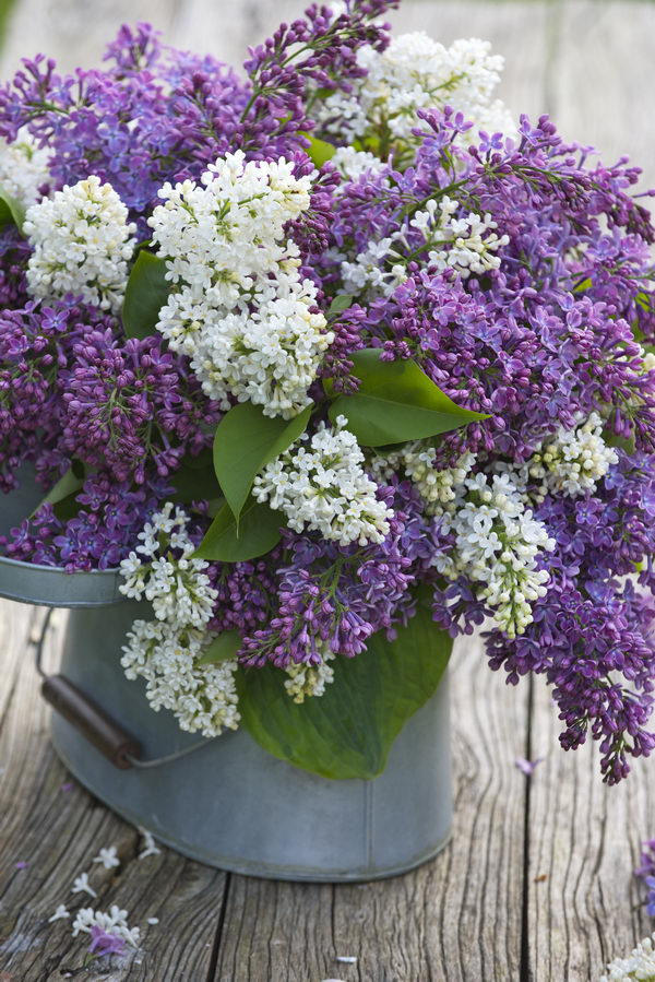 - Strauß mit weißem und rotem Flieder in einem Zinkeimer