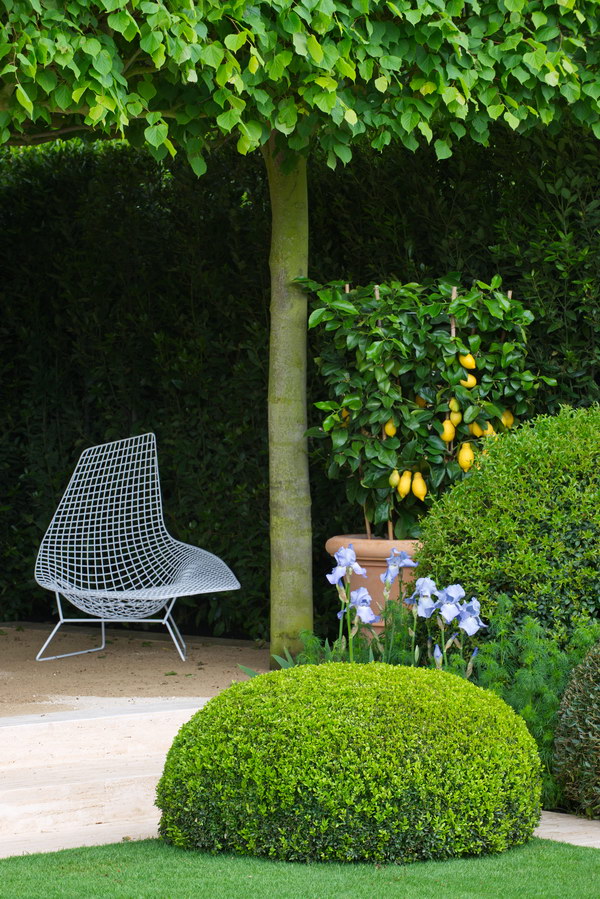 - Buchsbaumkugel, Buxus sempervirens, Chelsea Flower Show, Citrus, Formschnitt, Iris germanica, Linde, Rasen, Schirmgehölz, Tilia x europaea, Travertin, Zitrone