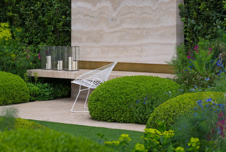 - Buchsbaumkugel, Buxus sempervirens, Chelsea Flower Show, Citrus, Formschnitt, Iris germanica, Linde, Rasen, Schirmgehölz, Tilia x europaea, Travertin, Zitrone, Chelsea Flower Show