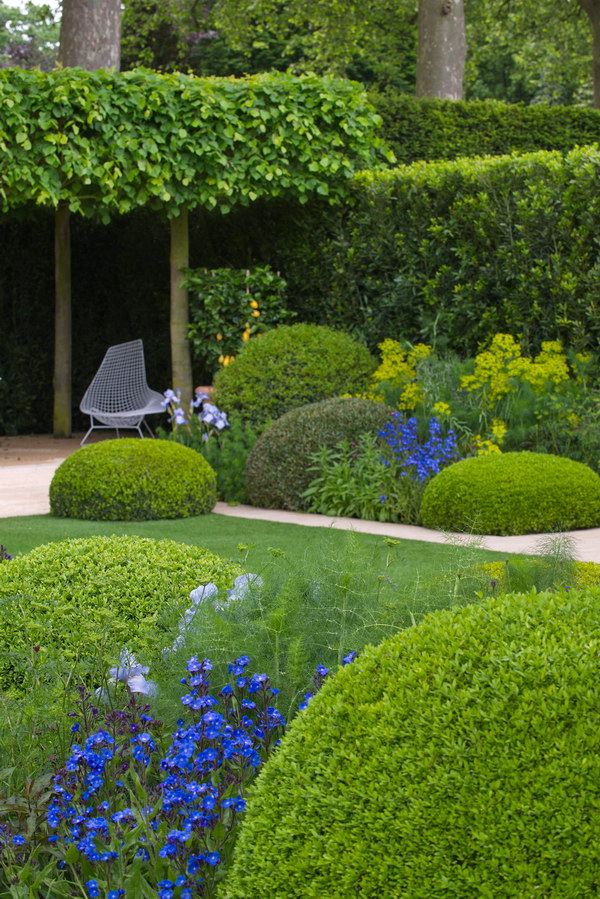 - Anchusa azurea 'Loddon Royalist', Buchsbaumkugel, Buxus sempervirens, Chelsea Flower Show, Euphorbia amygdaloides, Formschnitt, Laurus nobilis, Linde, Lorbeer, Osmanthus x burkwoodii, Rasen, Schirmgehölz, Tilia x europaea, Chelsea Flower Show