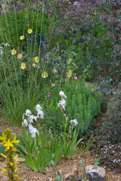 - Chelsea Flower Show, dunkellaubiger Storchschnabel, Geranium Hybride 'Sanne', Iris, Kiesgarten