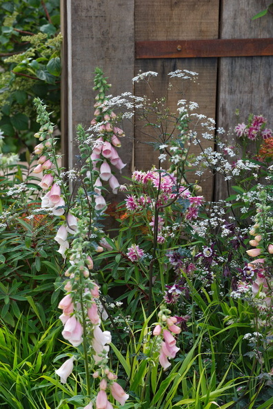 - Digitalis purpurea 'Sutton's Apricot', Aquilegia vulgaris 'Nora Barlow', Aquilegia 'William Guinness', Anthriscus sylvestris 'Ravenswing', Euphorbia griffithii 'Dixter', Lonicera 'Gold Flame'