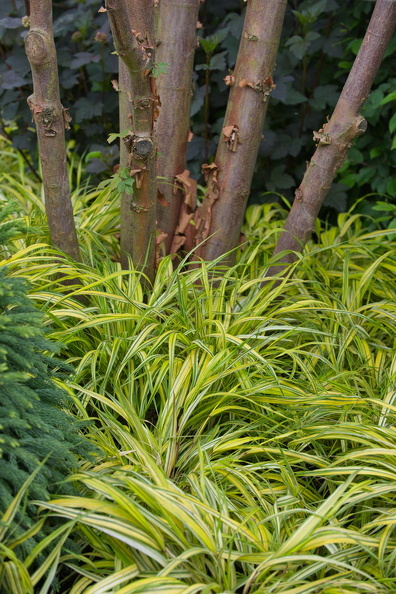 - Chelsea Flower Show, Cryptomeria japonica, Felsen, Findling, Liquidambar styraciflua, Physocarpus opulifolius, Sicheltanne, Stein, Viola cornuta
