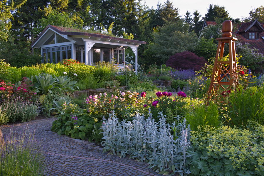 - Alchemilla mollis, Nepeta, Obelisk, Päonia, Stachys, Garten Scheele