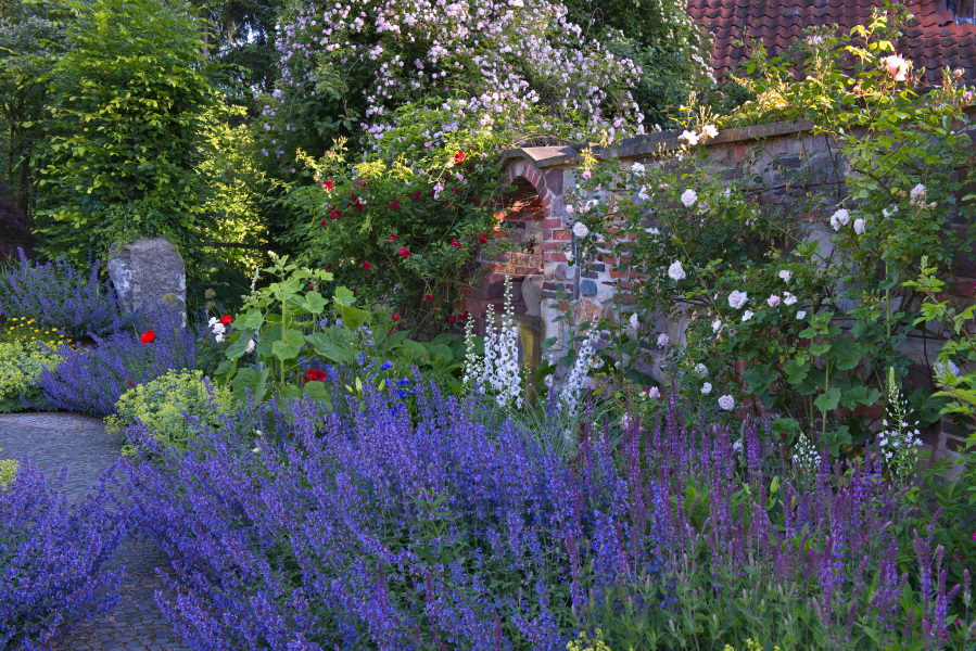 - Delphinium, Kletterrose 'Paul's Himalayan Musk', Mauer, Nepeta, Rabatte, Rosengarten, Zaun, Garten Scheele