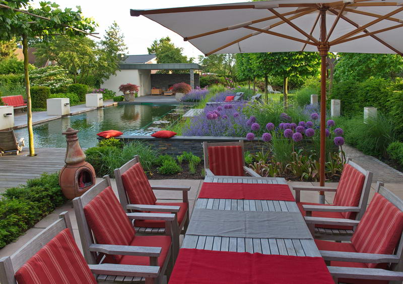 - Garten Christian Bahl, Schwimmteich, Sonnenschirm, Terrasse