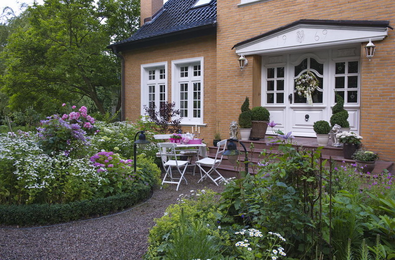 - Clematis, Hortensie, Sitzplatz, Tanacetum perthenium