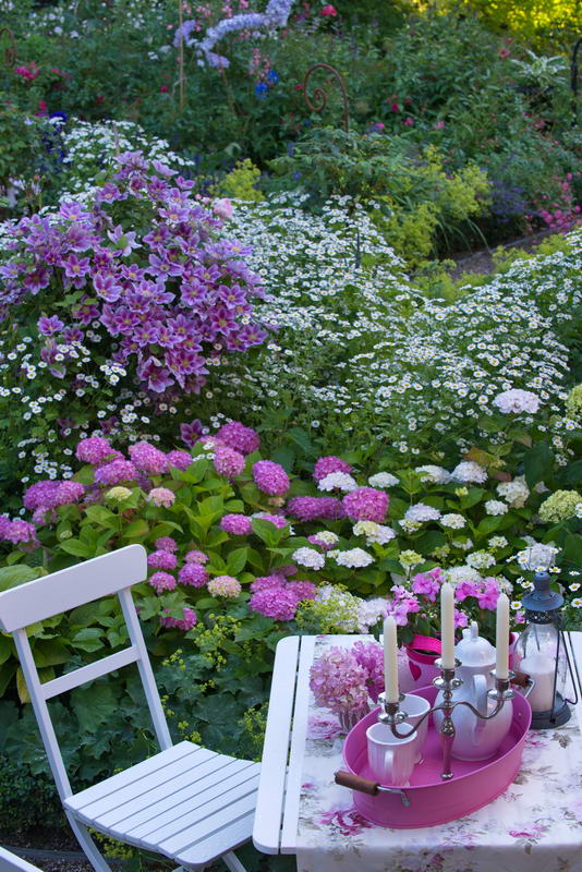 Clematis, Tanacetum, rosa, Garten Vollmert