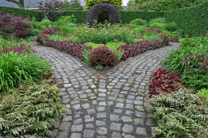 - Blattschmuckpflanzen, Buchenhecke, Einfassung, Garten Dingemans-Loos, Heuchera, Weg