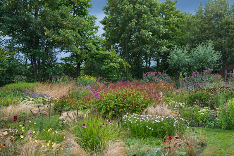 - Bistorta amplexicaule, Eupatorium, Gräser, Helenium, Jacobstuin, Stipa tenuissima