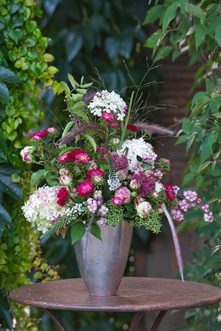 Astern, Hortensie, Pennisetum, Rosen, Sedum, Strauß