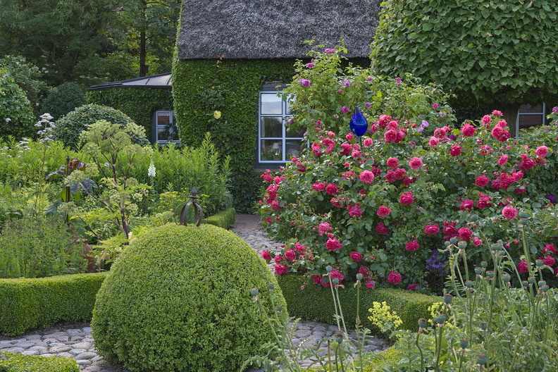 - Bauerngarten, Bauernhaus, Buchsbaumkugel, Feldsteine, Linden, Reet, Rose 'Rosarium Uetersen', Rose 'Rose de Resht', Weg, Digitalis, Lupine, Garten Christine Eichner