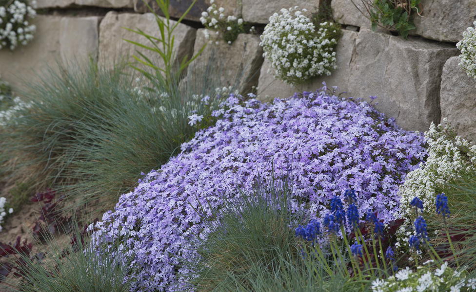 - Muscari, Naturstein, Phlox, Traubenhyazinthen, Trockenmauer, Alpen-Gämskresse, Hutchinsia alpina