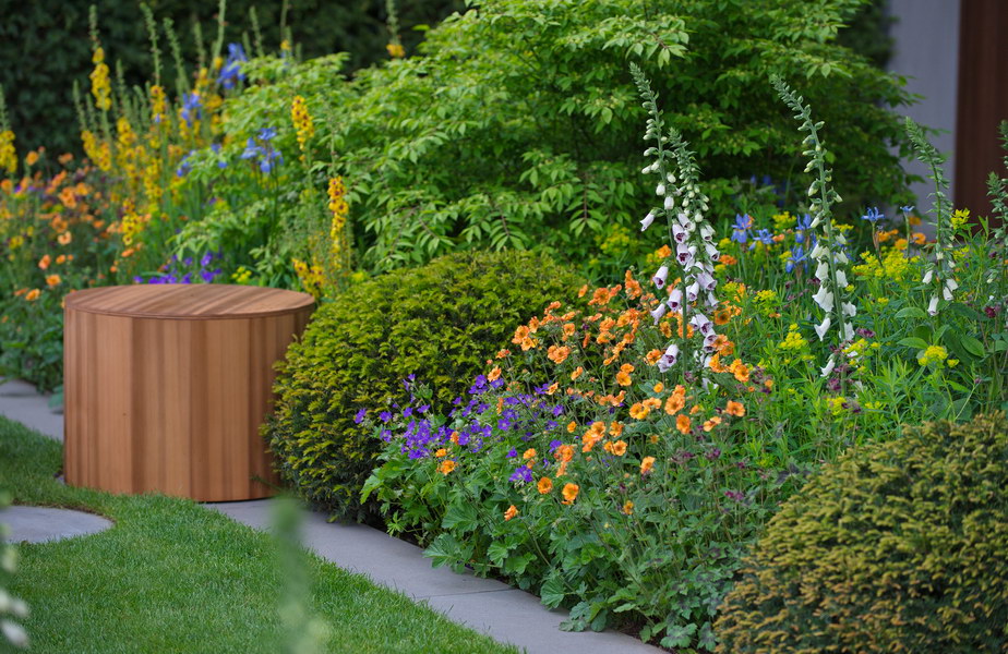 - Chelsea Flower Show, Euonymus alatus, Geranium phaeum, Geum, Hocker, Iris sibirica, Taxus bacata, Verbascum, Chelsea Flower Show