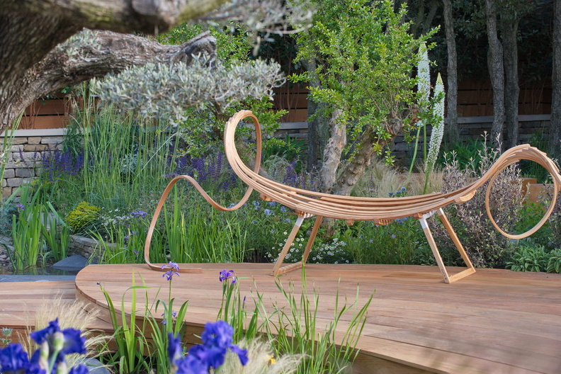 - Amsonia tabernaemontana, Bank, Blausternbusch, Chelsea Flower Show, Erigeron karvinskianiks, Holzdielen, Röhrenstern, Terrasse, Chelsea Flower Show