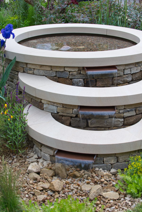 - Brunnen, Chelsea Flower Show, Kaskade, Kies, rund, Salvia nemorosa 'Caradonna', Wasser, Chelsea Flower Show