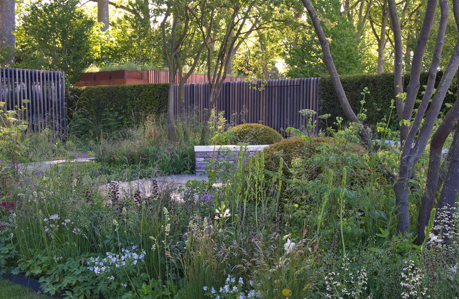- Baptisia australis, Briza media, Chelsea Flower Show, Deschampsia cespitosa, Deschampsia flexuosa, Gras, Gräserbeet, Hecke, Mauer, Naturstein, Sichtschutz, Zaun