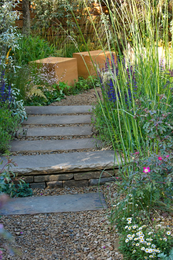 - Chelsea Flower Show, Erigeron karvinskianiks, Kies, Salvia nemorosa 'Caradonna', Stufen, Trittsteine, Weg, Chelsea Flower Show