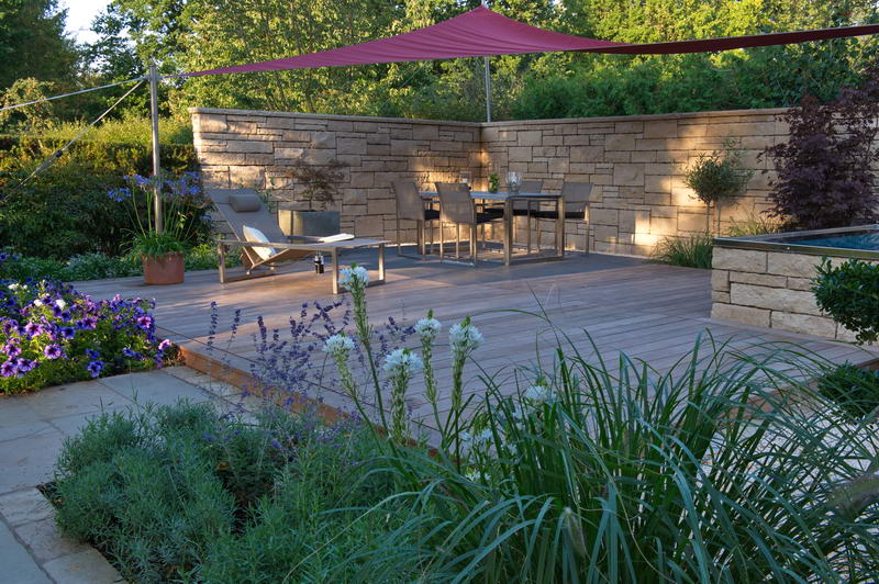 - Holzdeck, Sandsteinmauer, Sichtschutz, Sitzgruppe, Sonnensegel, Terrasse, Mauer, Garten Wandrey