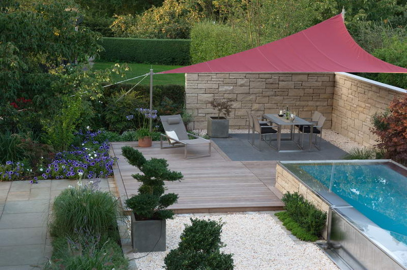 - Schwimmbecken, Sitzgruppe, Sitzplatz, Sonnensegel, Terrasse, Mauer, Garten Wandrey