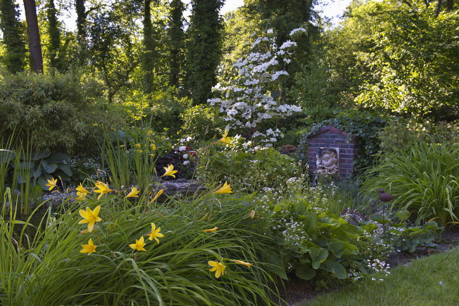 - Brunnen, Cornus 'Venus', Garten Eppen, Hemerocallis, Teich