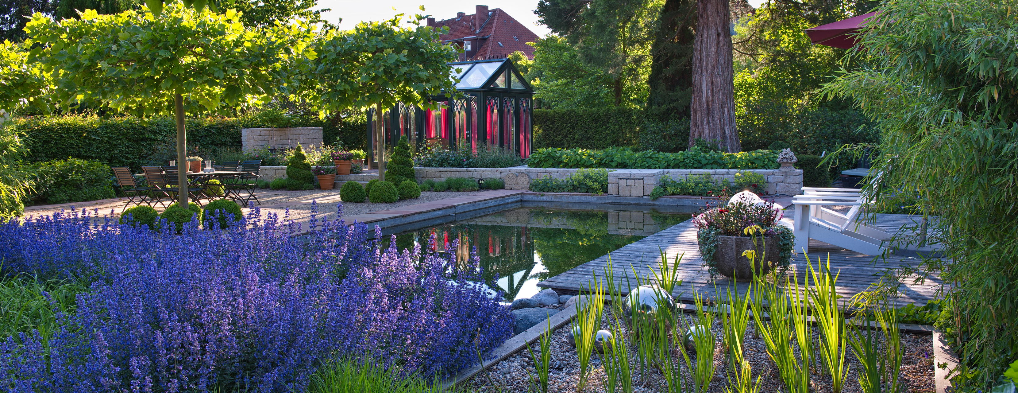 - Nepeta, Panorama, Schirmplatane, Schwimmteich