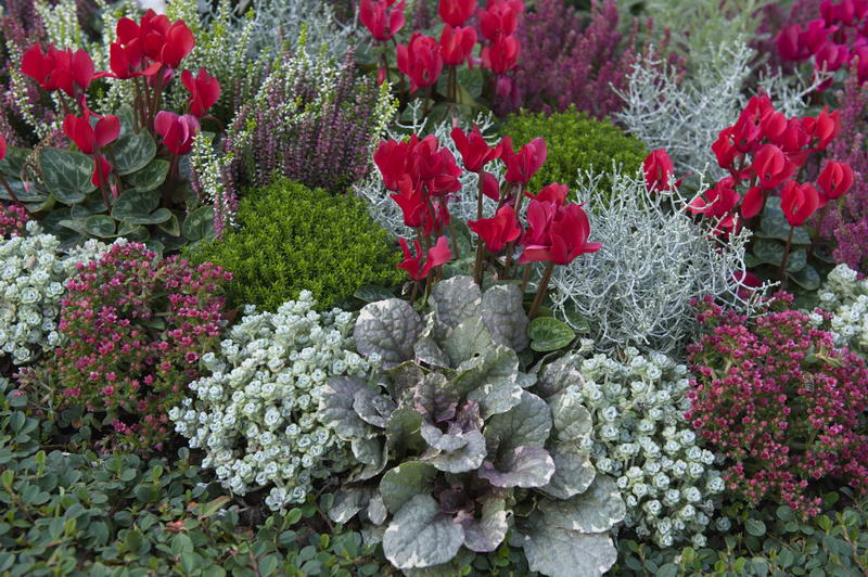 Ajuga, Cyclamen, Hebe, Calluna, Calocephalus, Cotoneaster