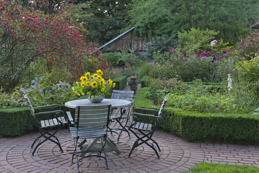 - Bauerngarten, Hagebutten, Rose, Sitzplatz, Sonnenblumen, Vase
