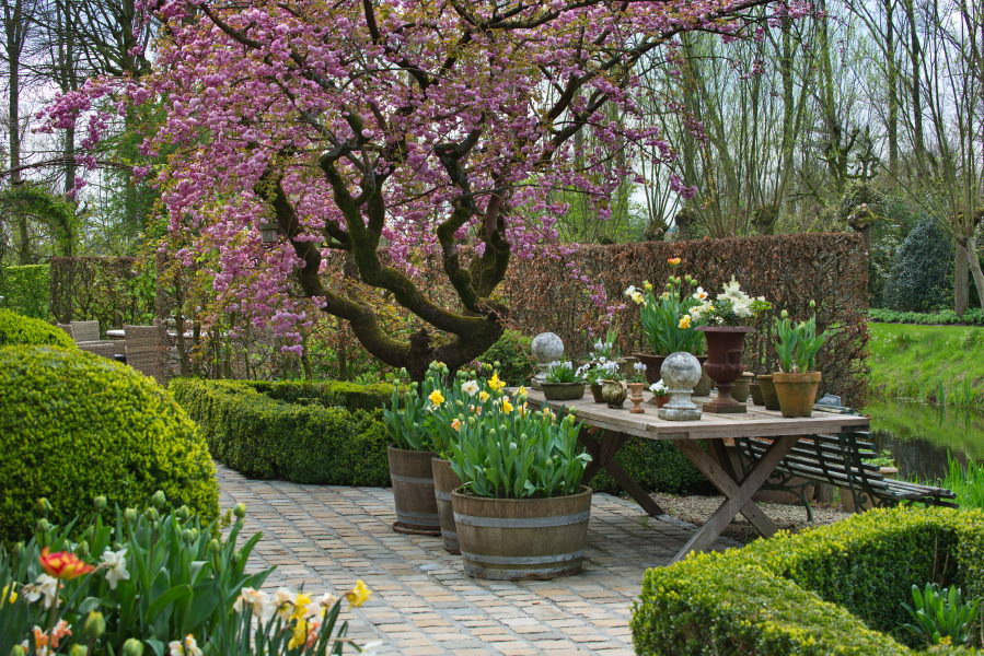 - Birgit Rousere, Buchsbaum, Kübel, Prunus serrula 'Kanzan', Terrasse, Zierkirsche