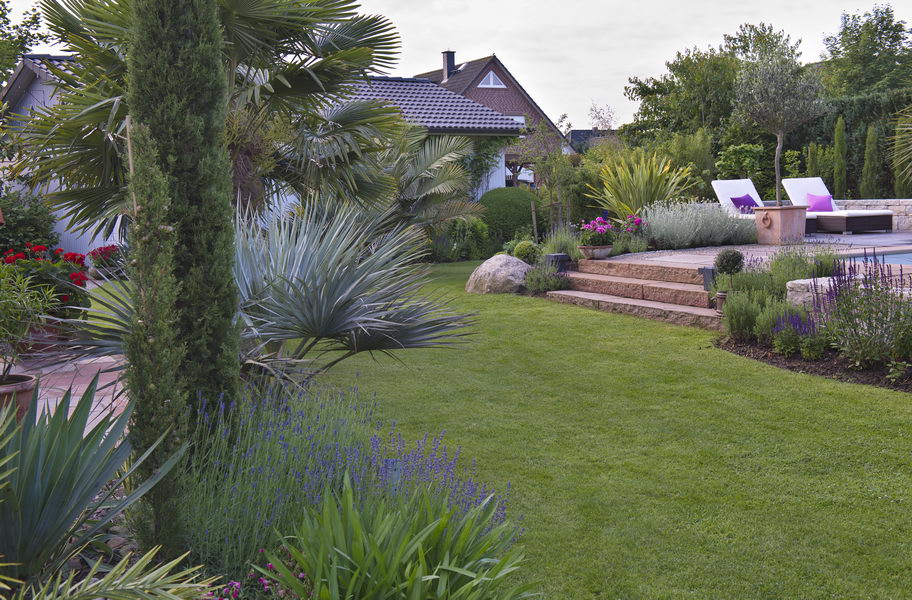 - Blaue Hesperidenpalme, Brahea armata, Cupressus sempervirens, Zypresse, mediterran
