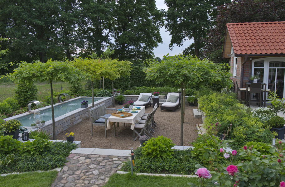 - Pool, Quercus palustris, Senkgarten, Sitzplatz, Sumpfeiche
