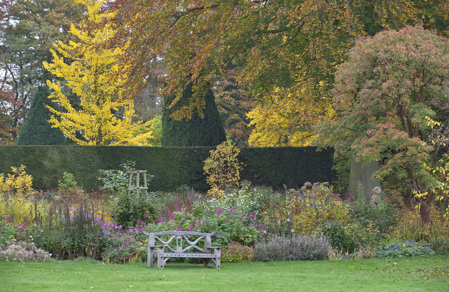 - Bank, Coton Manor Gardens, Ginkgo, Hecke, Herbstfärbung, Taxus