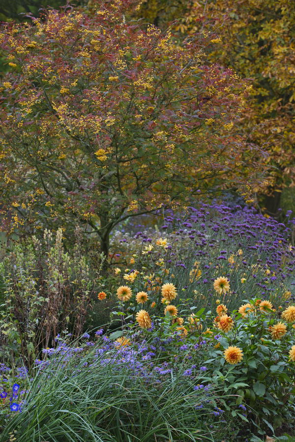 - Dahlia, Herbstfärbung, Rabatte, Sorbus 'Joseph Rock', Verbena bonariensis, orange, Coton Manor Gardens