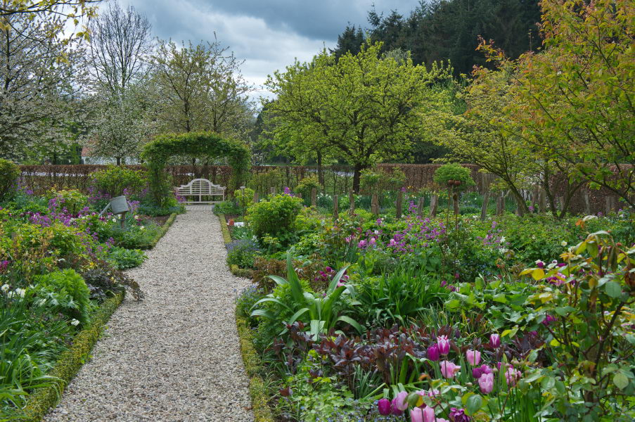 - Kiesweg, Lunaria, Tulpe 'Candy Prince', Tulpe 'Negrita', Tulpe 'Purple Prince', Tulpe 'Shirley', Tulpe 'Synaeda Amor', Tulpe 'Synaeda Blue', Weg, Garten Elisabeth Imig und Silke Imig-Gerold