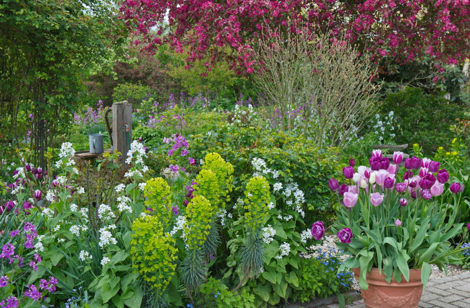 - Euphorbia characias ssp. wulfenii, Lunaria, Malus 'Rudolph', Tulpe 'Blue Diamond', Tulpe 'Candy Prince', Tulpe 'Negrita', Tulpe 'Purple Prince', Tulpe 'Shirley', Tulpe 'Synaeda Amor', Tulpe 'Synaeda Blue', Garten Elisabeth Imig und Silke Imig-Gerold