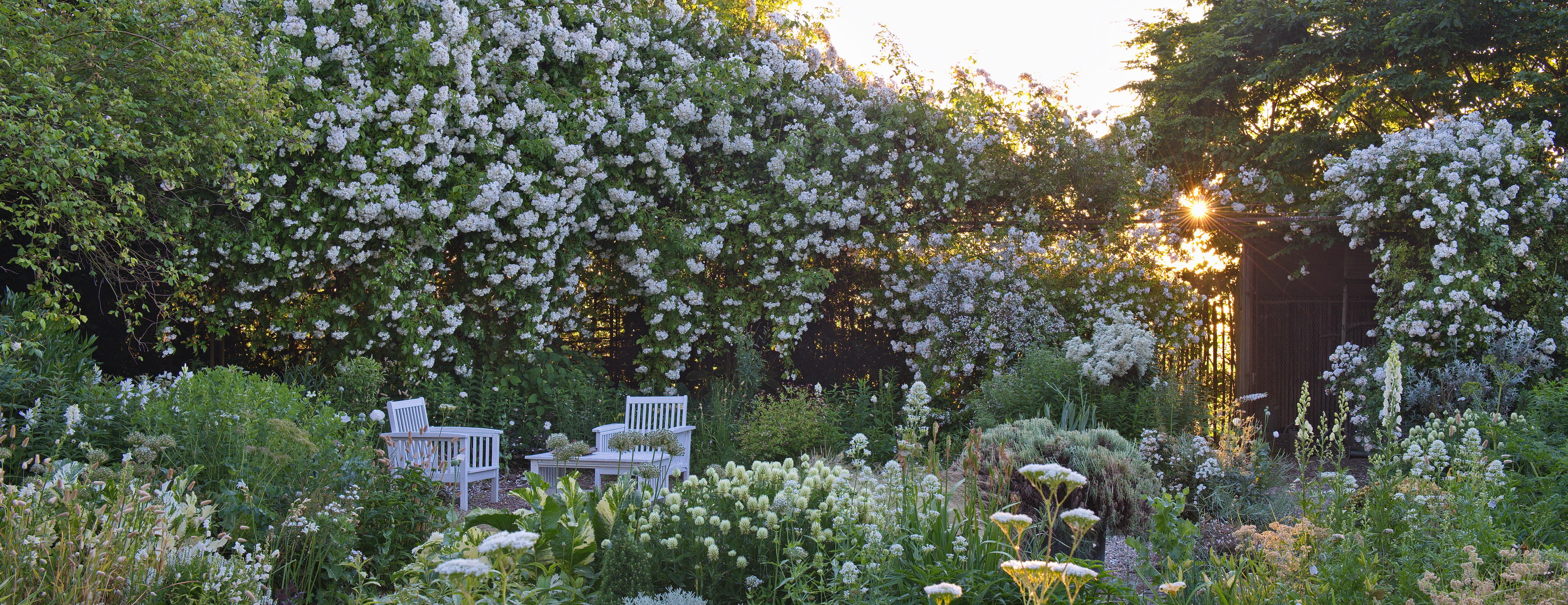 - Clematis recta, Kletterrose, Pergloa, Rosa 'Guirlande d'Amour', Rose 'Bobby James', Rose 'Climbing Schneewittchen', Sitzplatz, Trifolium, Valeriana alliariifolia, weißer Garten, Panorama