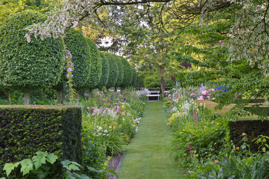 - Allee, Formschnitt, Hainbuche, Rabatte, Rose 'Bukavu', Rose 'Jacky's Favorite', Fam Laureys-Wynter