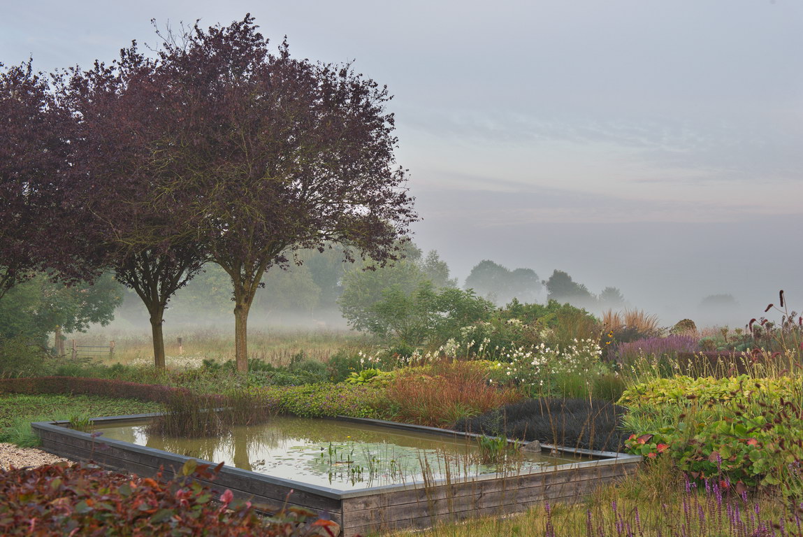 - Bergenia, Blutpflaume 'Nigra', Ophiopogon planiscapus 'Niger', Präriegarten, Prunus cerasifera 'Nigra', Teich, Wasserbecken