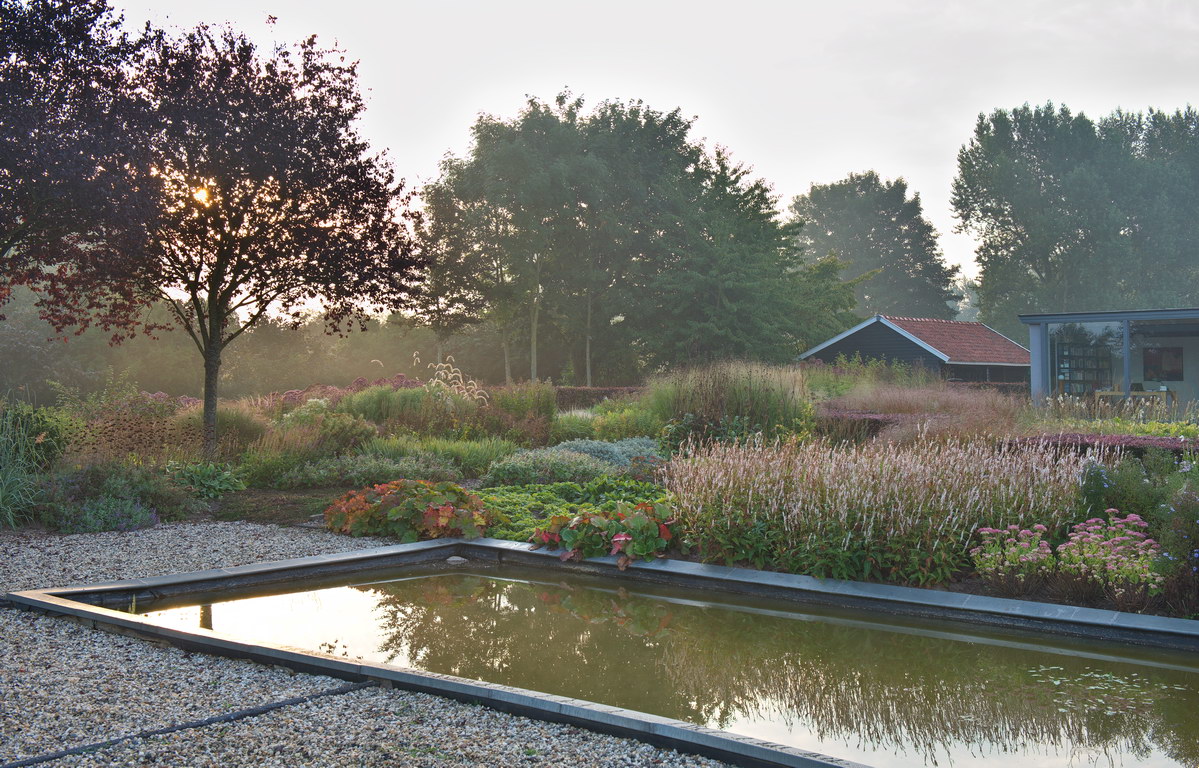 - Blutpflaume 'Nigra', Polygonum amplexicaule, Präriegarten, Prunus cerasifera 'Nigra', Teich, Wasserbecken
