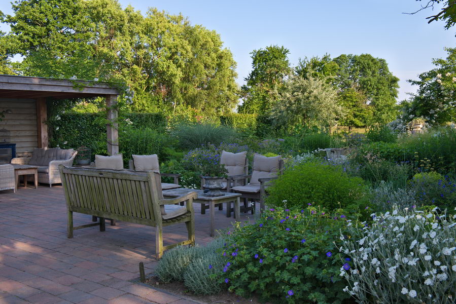 - gelb, Geranium 'Rozanne', Lychnis coronaria 'Alba, überdacht, Geerte's Tuin