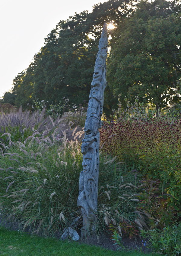 - Holzpfahl, Morlands Farm, Pennisetum, Schnitzerei, Sussex Prairie Gardens, Totempfahl
