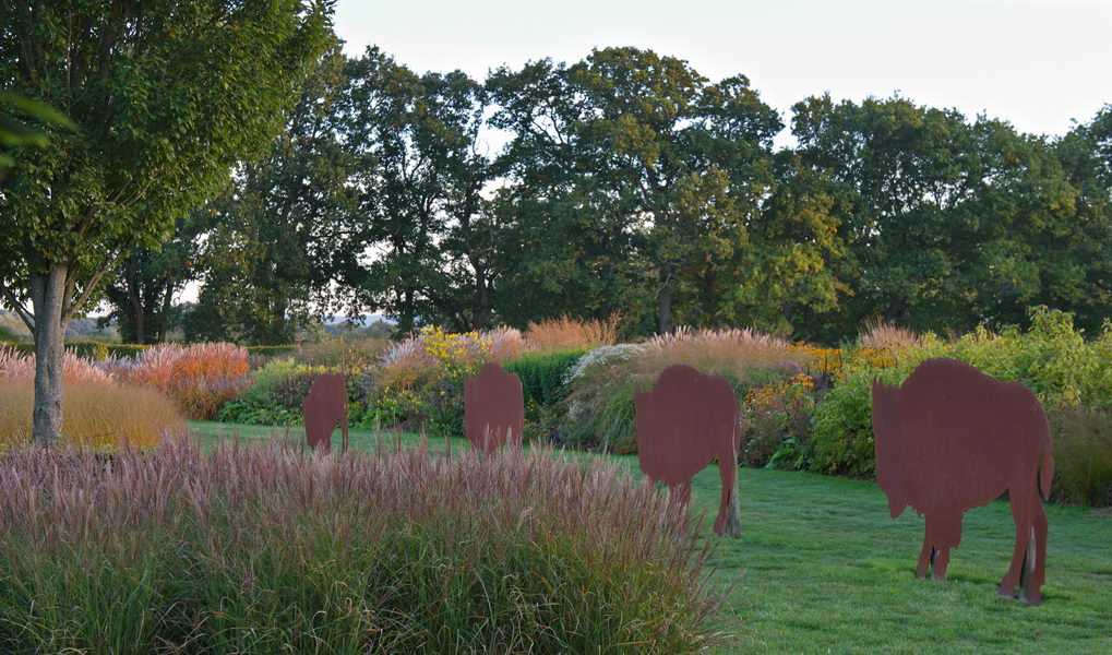 - Bison, Gräser, Miscanthus, Präriebeet, Miscanthus 'Kleine Silberspinne', Sussex Prairie Gardens, Morlands Farm