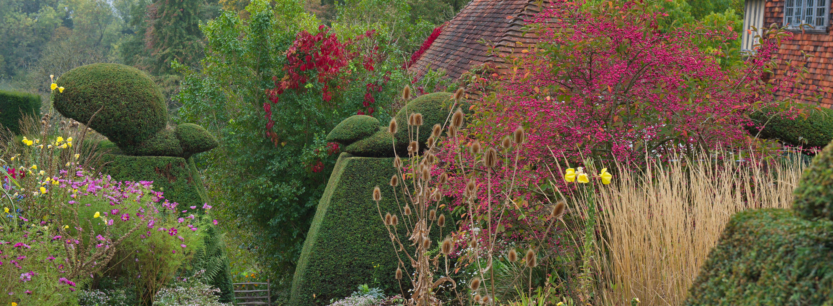 - Dipsacus fullonum, Euonymus europaeus, Gehölz, Oenothera, Taxus, Topiary, wilde Karde, Panorama