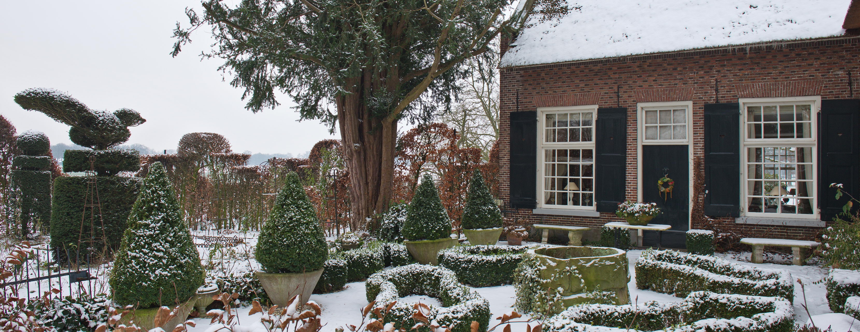 - Schneebedeckter Garten mit großer Eibe und Formschnitt
