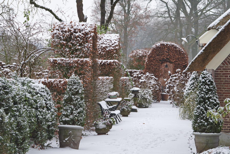 - Bogen, Fagus sylvatica, Garten Erve Odinc, Jasminum nudiflorum, Schnee
