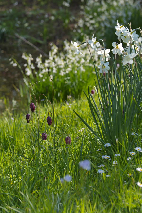 Fritillaria meleagris, Narcissus jonquilla 'Pueblo', Garten Maldegem