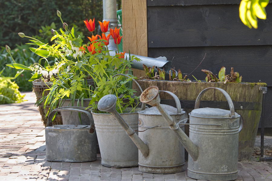 - Dicentra spectabilis 'Alba', Gießkannen, Zink, tränendes Herz, Garten Maldegem