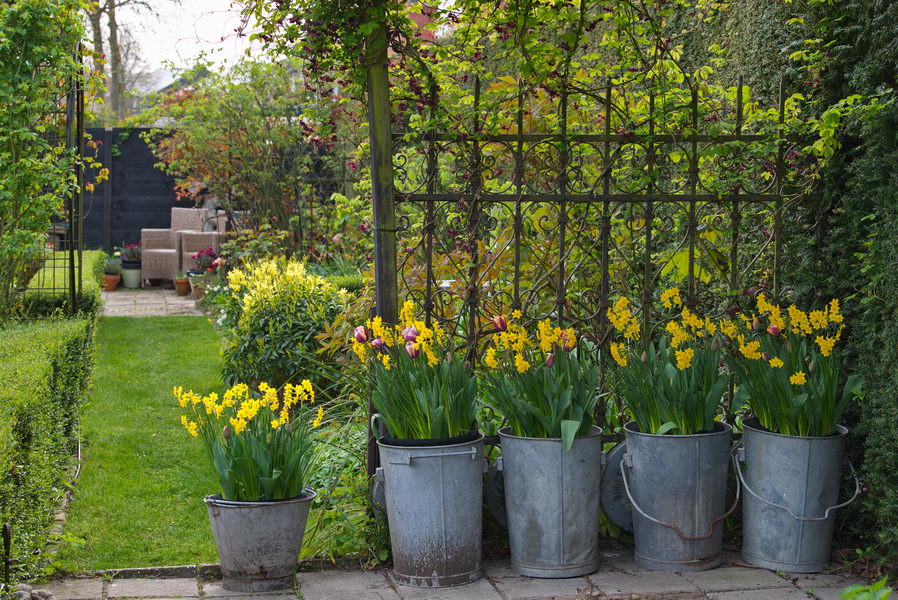 - Akebia quinata, Kübel, Narzissen, Zink, Garten van Baalen