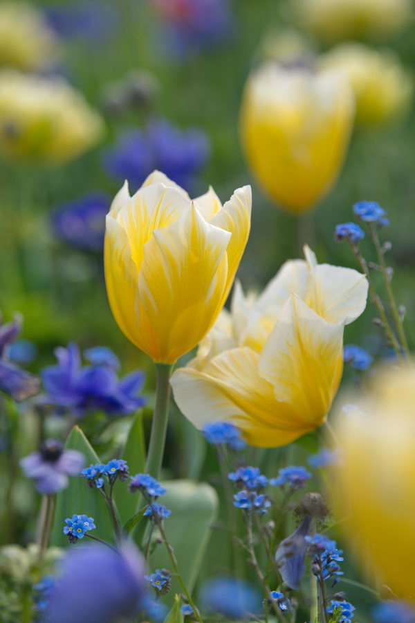 - Anemone coronaria 'Mr. Fokker', Myosotis, gelb, Garten van Baalen