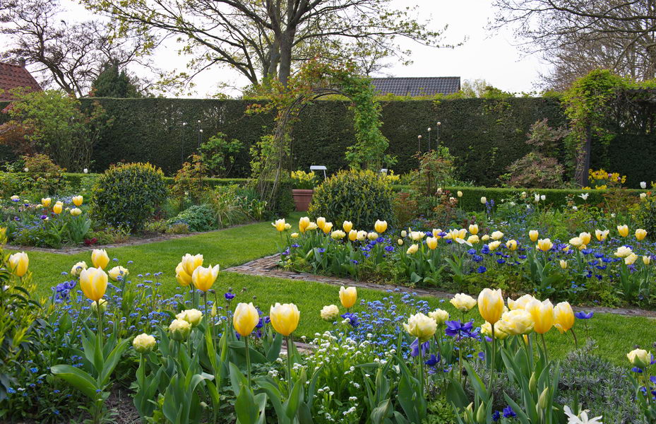 - Anemone coronaria 'Mr. Fokker', Myosotis, gelb, Garten van Baalen